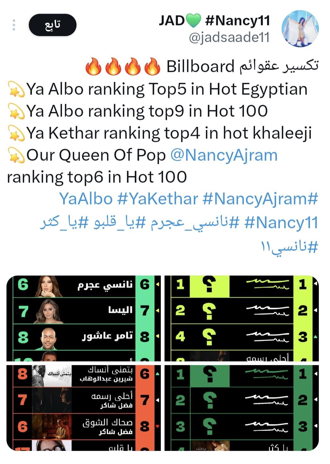 واضح انك راقد على روحك وماتعرف ان نانسي يالسه تدفع فلوس حق اللي يصورون اغنيتها تيتكوك ياقلبو ولا فاد ولا طلع البومها ترند بالعالم العربي فضلا عن العالم